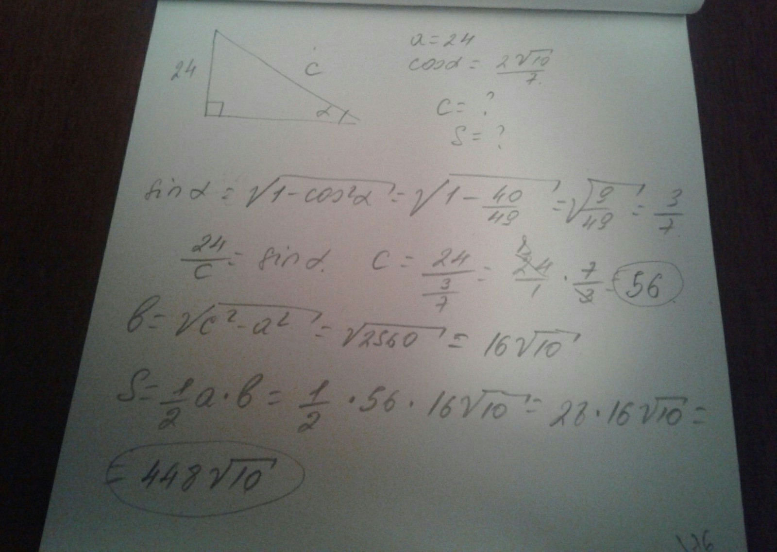 В прямоугольном треугольнике один из катетов равен 24, а косинус угла, противолежащего данному катету, равен (2 корня из 10)/7 Найдите гипотенузу и площадь треугольника.