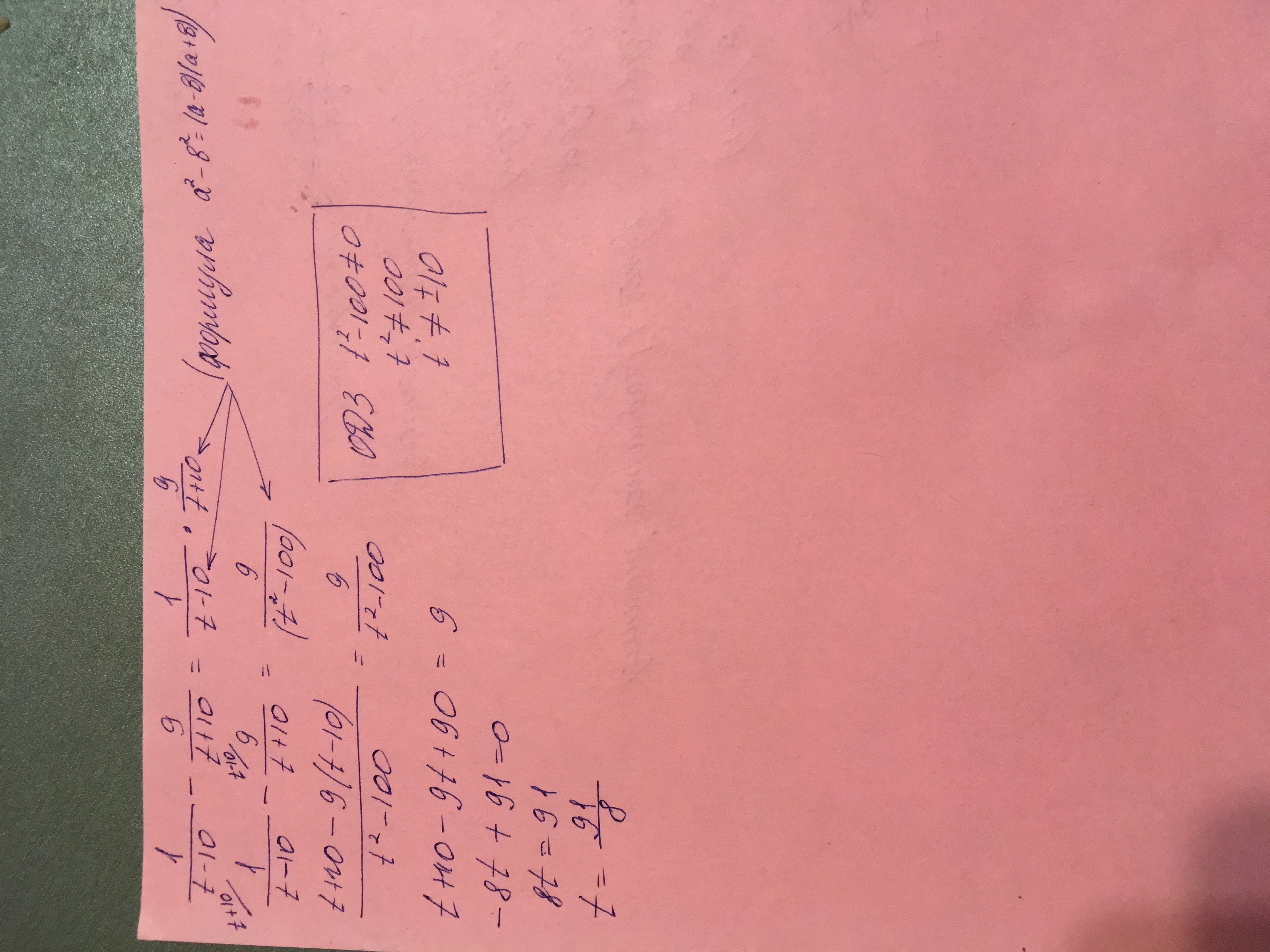 Определи значение переменной t, при котором разность дробей 1/t-10 и 9/t+10 равна их произведению.