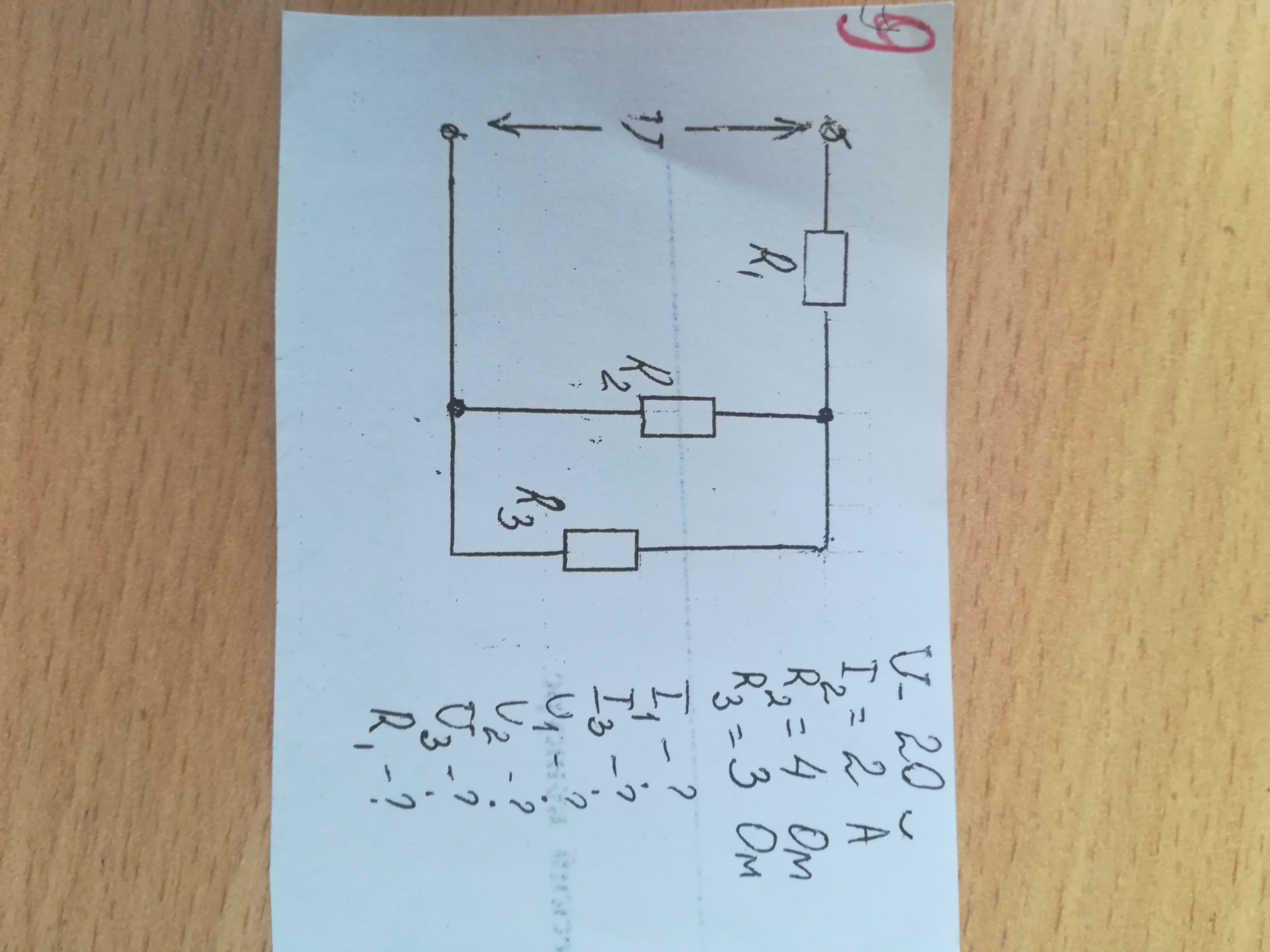 U2=2*4=8A==U3, U1=20-8=12B, I3=8/3=2.33A, I1=2+2.33=4.33A, R1=12/4.33≈2.77 Ом