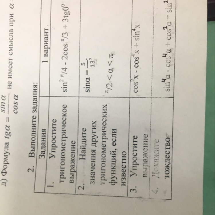 1.;sin^2fracpi4-2cosfracpi3+3tg0^o=left(sinfracpi4right)^2-2cdotfrac12+3cdot0=left(frac1{sqrt2}right)^2-1=frac12-1=-frac12\\2.;sinalpha=frac5{13}\cosalpha=sqrt{1-sin^2alpha}=sqrt{1-frac{25}{169}}=sqrt{frac{144}{169}}=pmfrac{12}{13}\fracpi2<alpha<piRightarrowcosalpha<0\cosalpha=-frac{12}{13}\tgalpha=frac{sinalpha}{cosalpha}=frac5{13}:frac{12}{13}=frac5{13}cdotfrac{13}{12}=frac5{12}\ctgalpha=frac1{tgalpha}=frac{12}5=2frac25=2,4