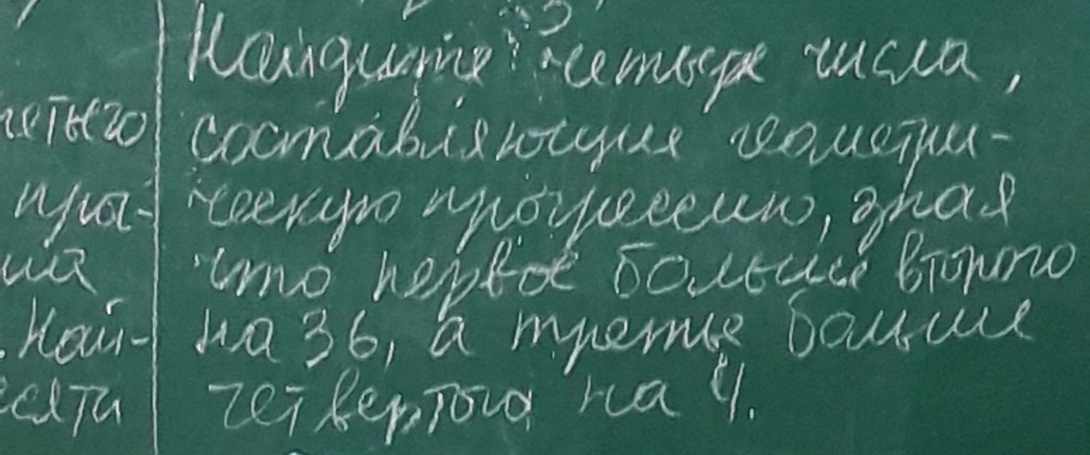 begin{cases}b_1-b_2=36\b_3-b_4=4end{cases}Rightarrowbegin{cases}b_1-b_1q=36\b_1q^2-b_1q^3=4end{cases}Rightarrowbegin{cases}b_1=frac{36}{1-q}\frac{36q^2}{1-q}-frac{36q^3}{1-q}=4end{cases}\frac{36q^2}{1-q}-frac{36q^3}{1-q}=4\frac{36q^2(1-q)}{1-q}=4\36q^2=4\q^2=frac4{36}\q=pmfrac26=pmfrac13\begin{cases}b_1=27\q=-frac13end{cases}quadquadquad u/|uquadquadquadbegin{cases}b_1=54\q=frac13end{cases}\\27,;-9,;3,;-1\u/|u\54,;18,;6,;2