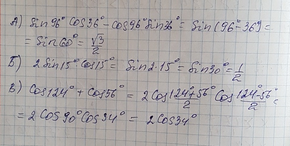 тригонометрические преобразования.1)вычислить А)sin96°×cos36°-cos96°×sin36°=