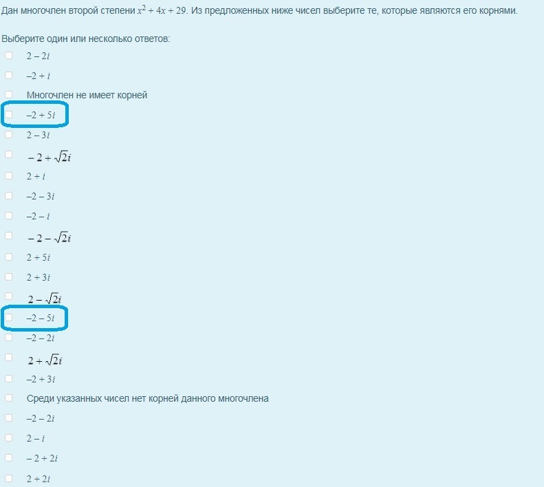 Дан многочлен второй степени x² + 4x + 29. Из предложенных ниже чисел выберите те, которые являются его корнями.