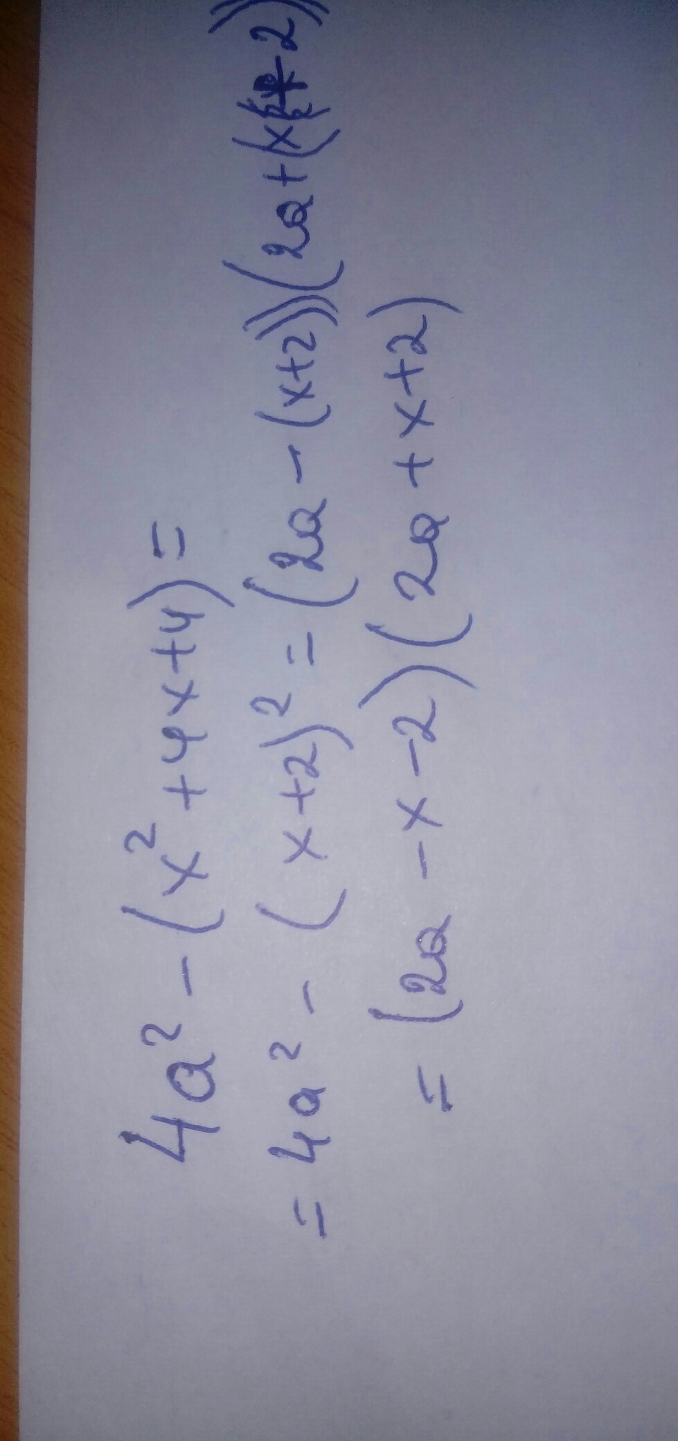=4а в кв.-(х в кв.+4х+4)=.......(2а-×-2)×(2а+х+2)