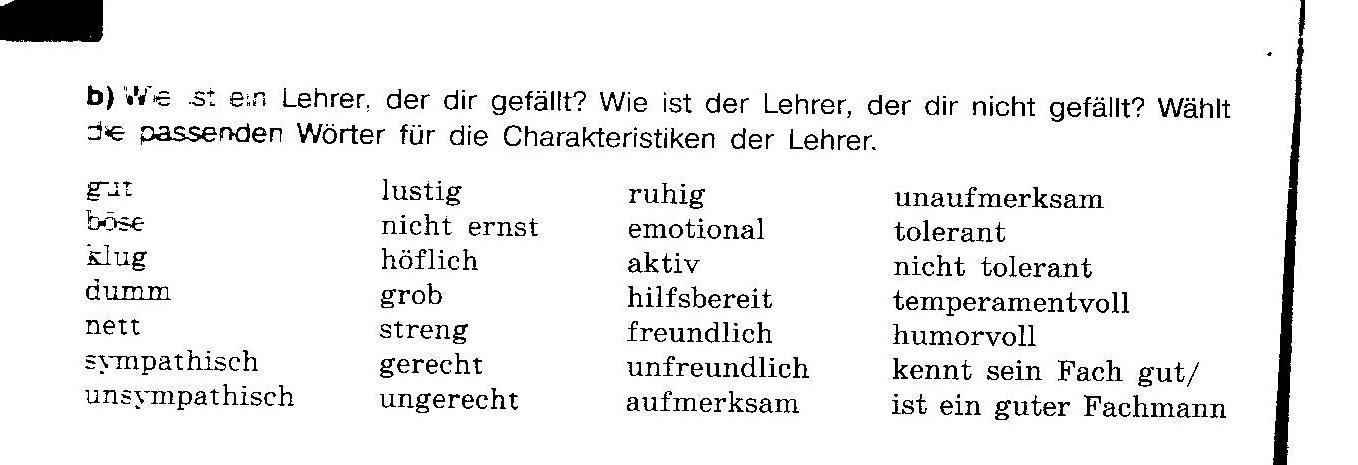 Ein Lehrer, der mir nicht gefällt, ist: böse, dumm, unsympatisch, nicht ernst, grob, streng, ungerecht, unfreundlich, unaufmerksam, untolerant.