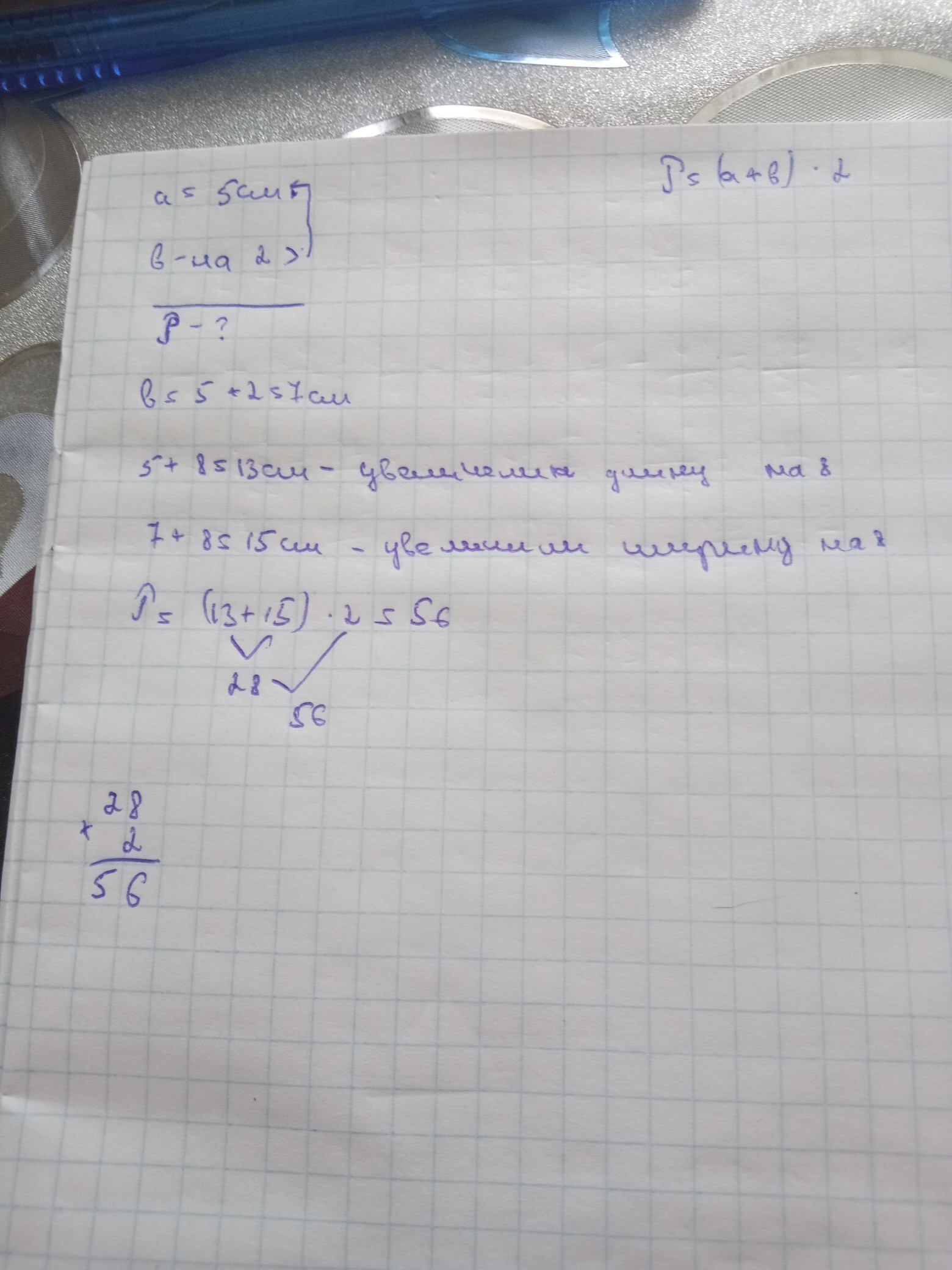 длина прямоугольника 5см,аширина на 2см больше.Стороны увеличили на 8см.Чему равен периметр нового прямоугольнака?