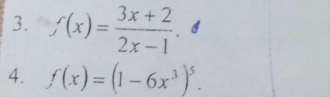 3)f(x)=frac{3x+2}{2x-1}\\f'(x)=frac{(3x+2)'*(2x-1)-(3x+2)(2x-1)'}{(2x-1)^{2} }=frac{3(2x-1)-2(3x+2)}{(2x-1)^{2} }=frac{6x-3-6x-4}{(2x-1)^{2} } =-frac{7}{(2x-1)^{2} }