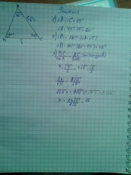 В треугольнике АВС угол С = 75°, что на 15° больше величину угла А, АС = 4√6 см. Найдите сторону ВС.