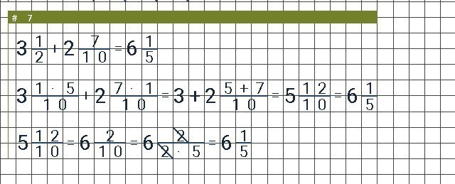 3 1/2 + 2 7/10 = 3 5/10 + 2 7/10 = 5 12/10 = 6 2/10 = 6 1/5