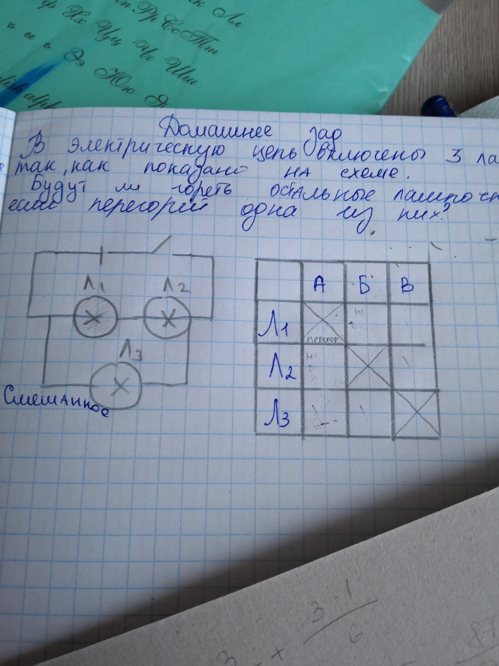 В электрическую цепь включены 3 лампочки так, как показано нп схеме. Будут ли гореть остальные лампочки если перегорит 1 из них