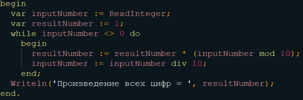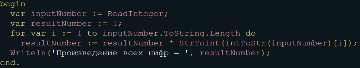 То, как нужно писать на PascalABC с его возможностями. Если Вас устрашает запись на пятой строке, то не стоит волноваться. Читаем с конца: превращаем число в строку (IntToStr), берём i-тую цифру (цикл будет идти с каждым умножением цифры на следующую), превращаем обратно цифру в строку и умножаем на имеющееся произведение.