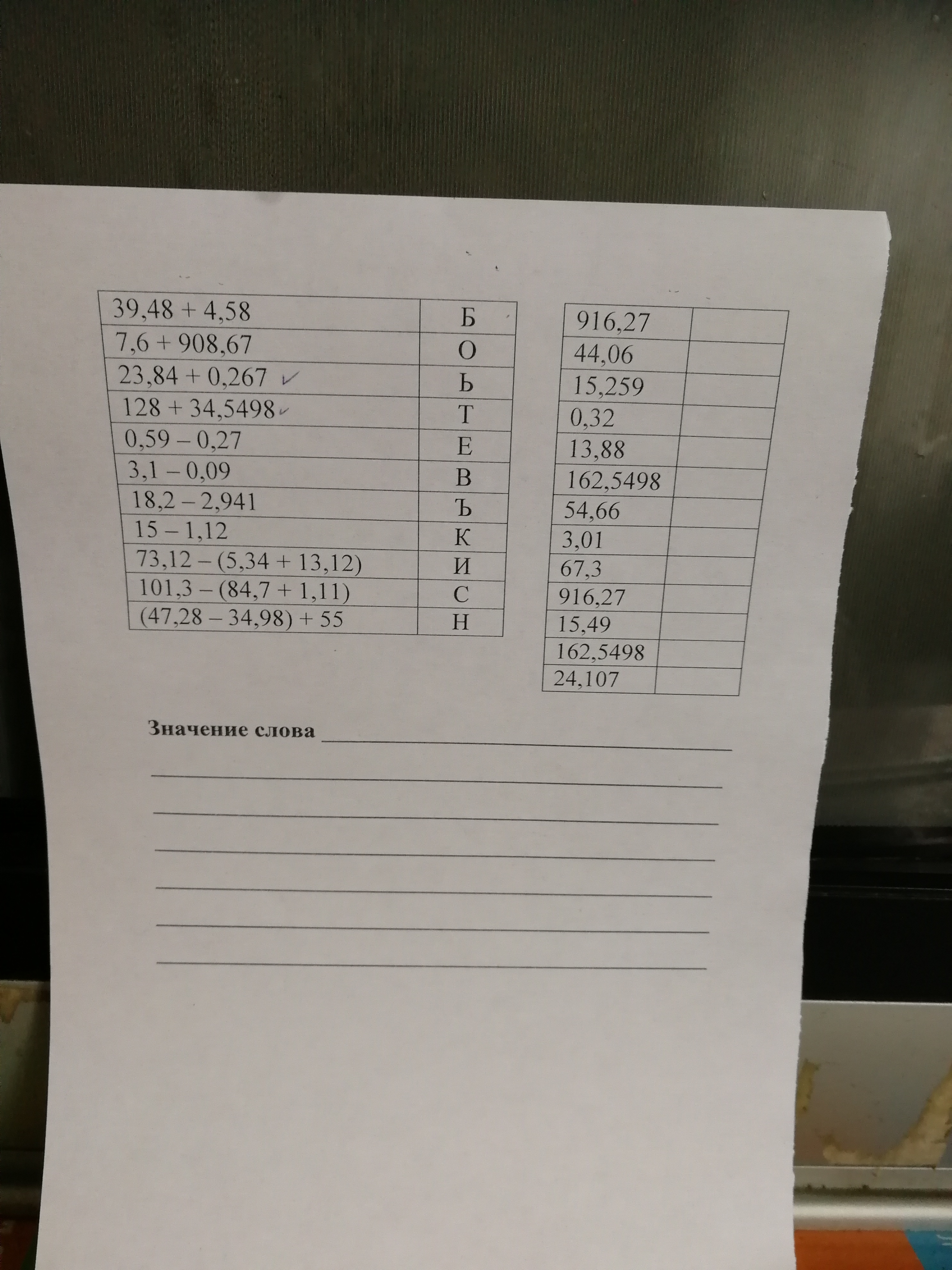 Нужно было решить все примеры, а потом те ответы которые получились соотнести в том порядке, в котором находятся числа в правом столбике. Решаешь пример, смотришь какая это буква и соотносишь эту букву рядом с ответом в правом столбике.