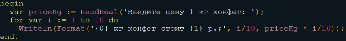 В магазине продают конфеты в упаковках по 0.1кг,0.2кг,...0.9,1кг.Известно что 1 кг конфет стоит х рублей.Выведите стоимости каждой упаковке в виде :
