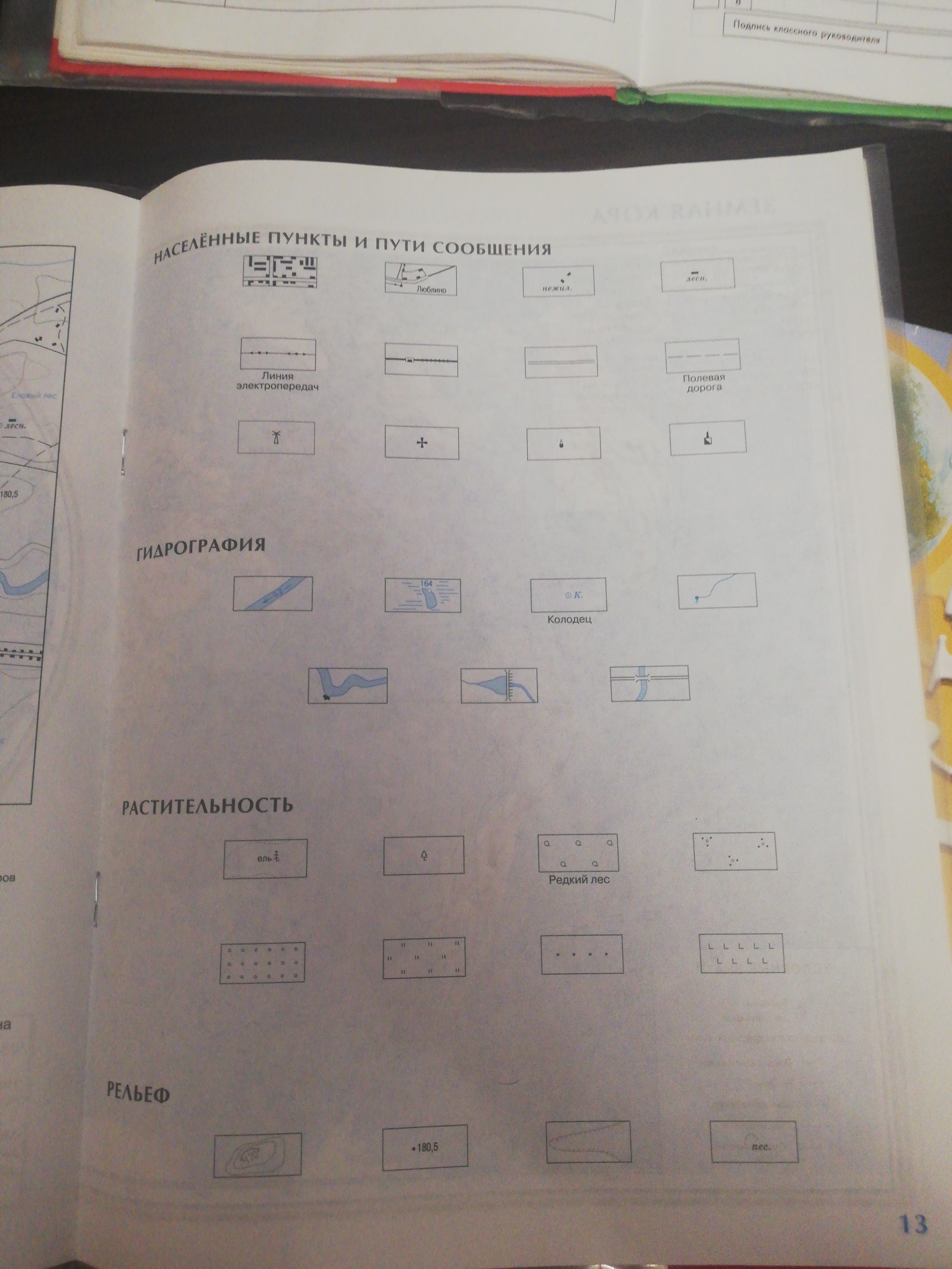 1.Река, направление течения; 2.Озеро или болото, высота точки над уровнем моря; 3.Колодец; 4.Родник или река; 5.Пристань; 6.Плотина; 7.Мост.