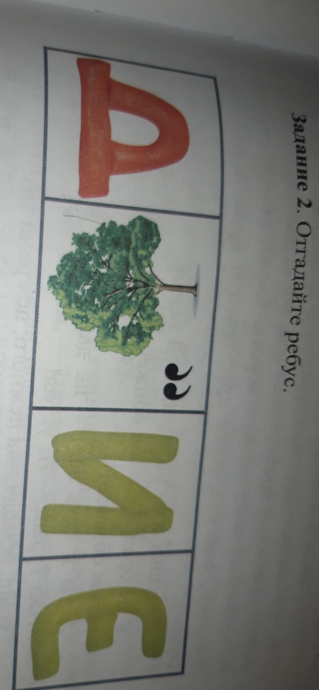 "ДЕРЕВО", рисунок перевернут, значит будет "ОВЕРЕД", и убираем две последних буквы, т.к. после рисунка две запятые ⇒ ОВЕР +