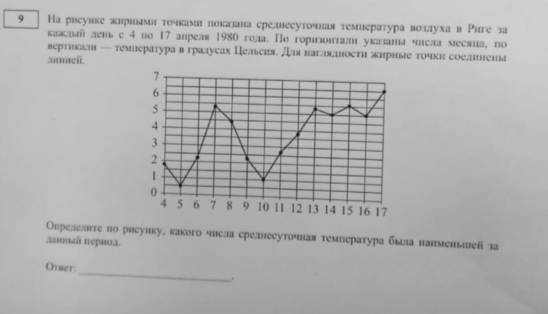 на рисунке жирными точками показана среднесуточная температура воздуха в Риге за каждый день с 14 по 18 апреля 1980 года по горизонтали указано учился а ещё по вертикали температура в градусах Цельсия для наглядности жирные точки соединены Определите по рисунку современного Восточного температурного