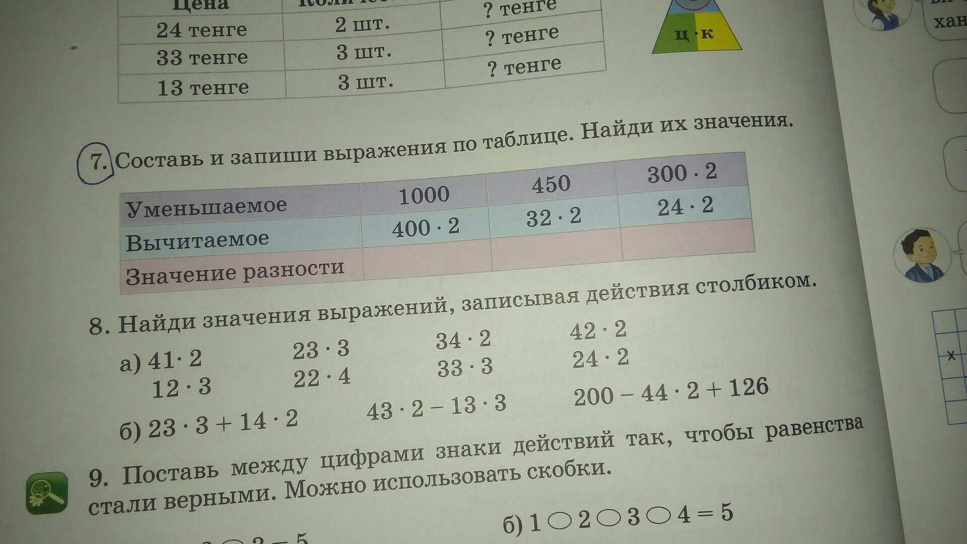 Здравствуй! Давай попробуем вместе решить. Для начала разберемся, как называются определенные цифры при вычитании. Допустим, 3-1=2. 3 - уменьшаемое, 1 - это вычитаемое, а 2 - разность. Теперь посмотрим на задачу. Уменьшаемое у нас - 1000 ( в первом случае), вычитаемое - 400*2. Нам нужно найти разность. Ну, первым шагом к решению будет нахождение вычитаемого. Умножаем 400 на 2 и получаем 800. Теперь нам нужно из 1000 вычесть 800. Сколько получим? 200. Записываем в значение разности. Таким же образом выполняем два остальных пункта. 32*2 = 64. 450-64 = 386. В третьем пункте нужно найти и уменьшаемое и вычитаемое, что далее вычислить разность. 300*2 = 600. 24*2 = 48. 600-48 = 552