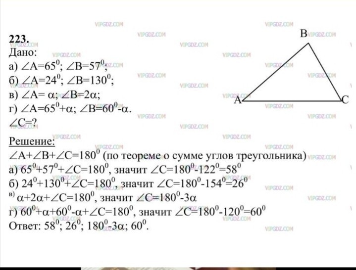 А) 180°-(65°+57°)=59°