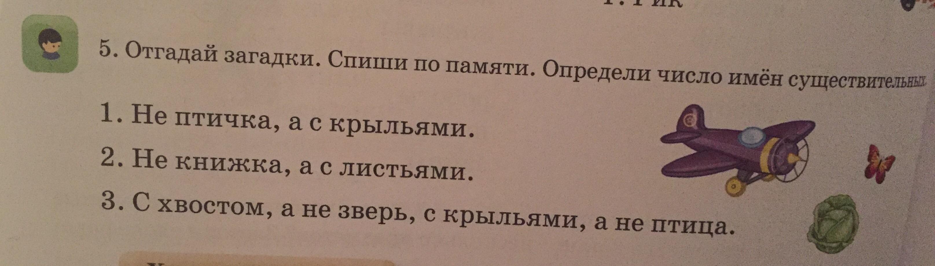 отгадай загадки. Спиши по памяти. Определи число имен существительных. 1. не Птичка а с крыльями.2. не книжка А с листьями 3.с хвостом а не зверь с крыльями а не птица