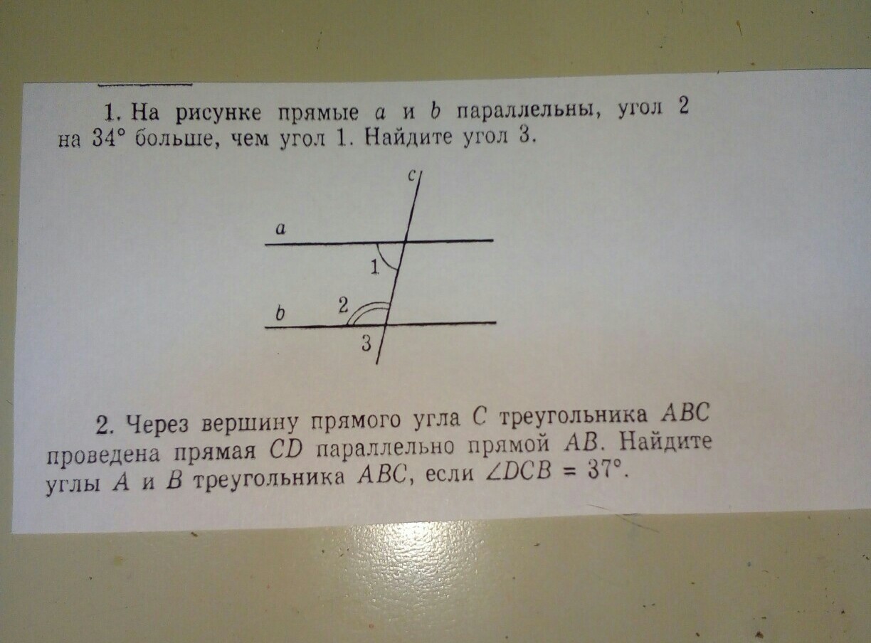сумма углов 1 и 2 составляет 180 градусов (180-34)/2=73 угол 1