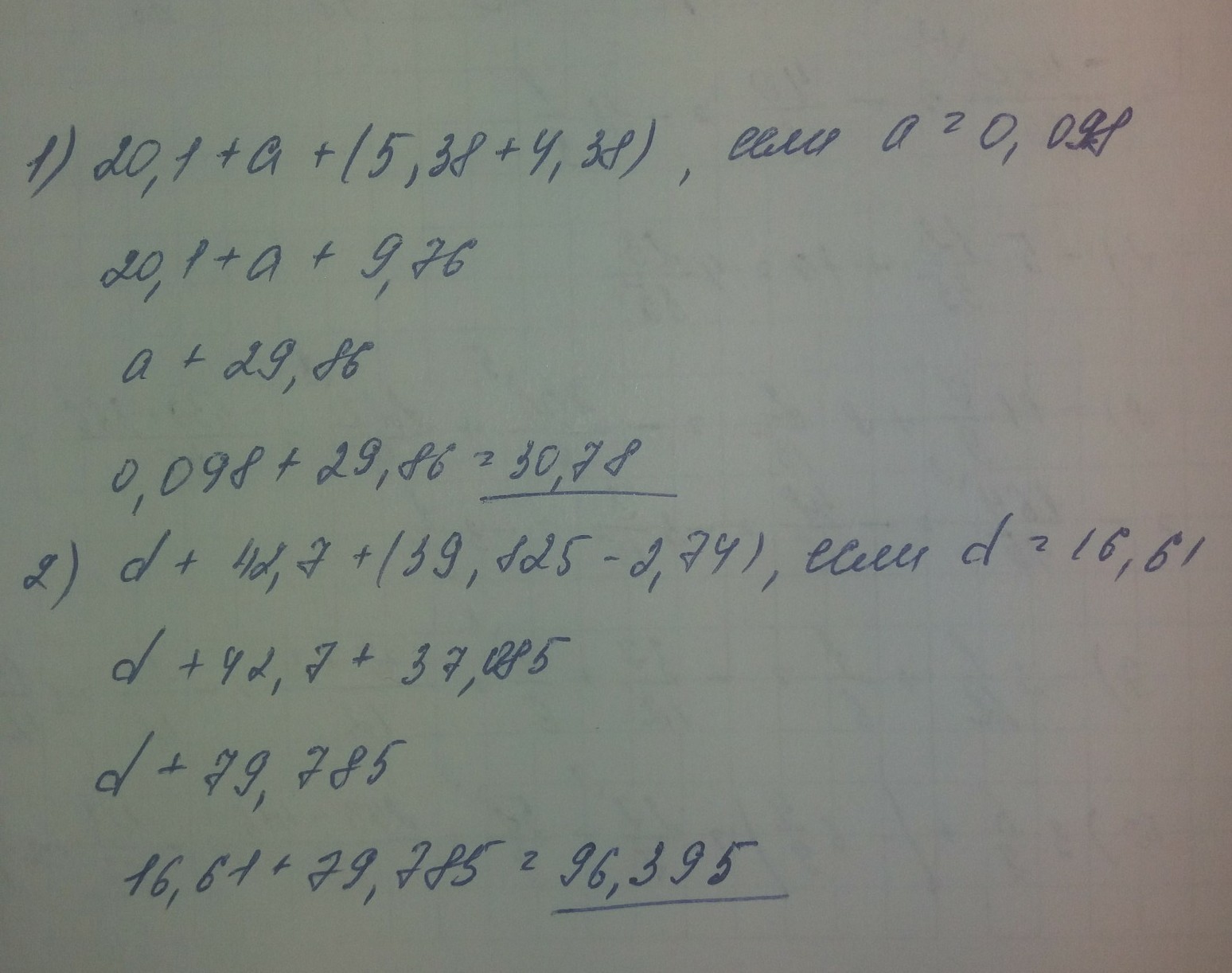 1)20,1 +а +(5,38+4,38), если а=0,098 2) d+42,7+(39,825-2.74) если d=16,61