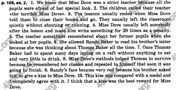 108, отл. 2. 1. Мы знаем, что мисс Дав была учительницей, потому что ученики боялись ее особого взгляда. 2. Дети назвали свою учительницу ужасной мисс Голубь. 3. Уроки обычно заканчивались, когда мисс Дав говорила им закрыть книги и уходить. Обычно они тихо покидали класс, не крича и не убегая. 4. Мисс Дав обычно оставляла кого-то после урока и заставляла его писать что-то 20 раз в качестве штрафа. Учитель иногда вспоминал о своих бывших учениках, когда она смотрела на своих учеников. 6. Она позволила Рэнди Бейкеру прочитать письмо его брата, потому что она все время думала о Томасе Бейкере. 7. Однажды Томасу Бейкеру пришлось много дней лежать на плоту, ничего не есть и очень мало пить. 8. Методы мисс Дав помогли Томасу выжить, потому что он вспомнил ее уроки и повторил себе, что скоро все закончится. 9. Лицо Рэнди стало очень красным, потому что его брат попросил его поцеловать мисс Дав. 10. Этот поцелуй был сравнен с медалью и полностью с ней согласен. Я думаю, что поцелуй был лучшей наградой для мисс