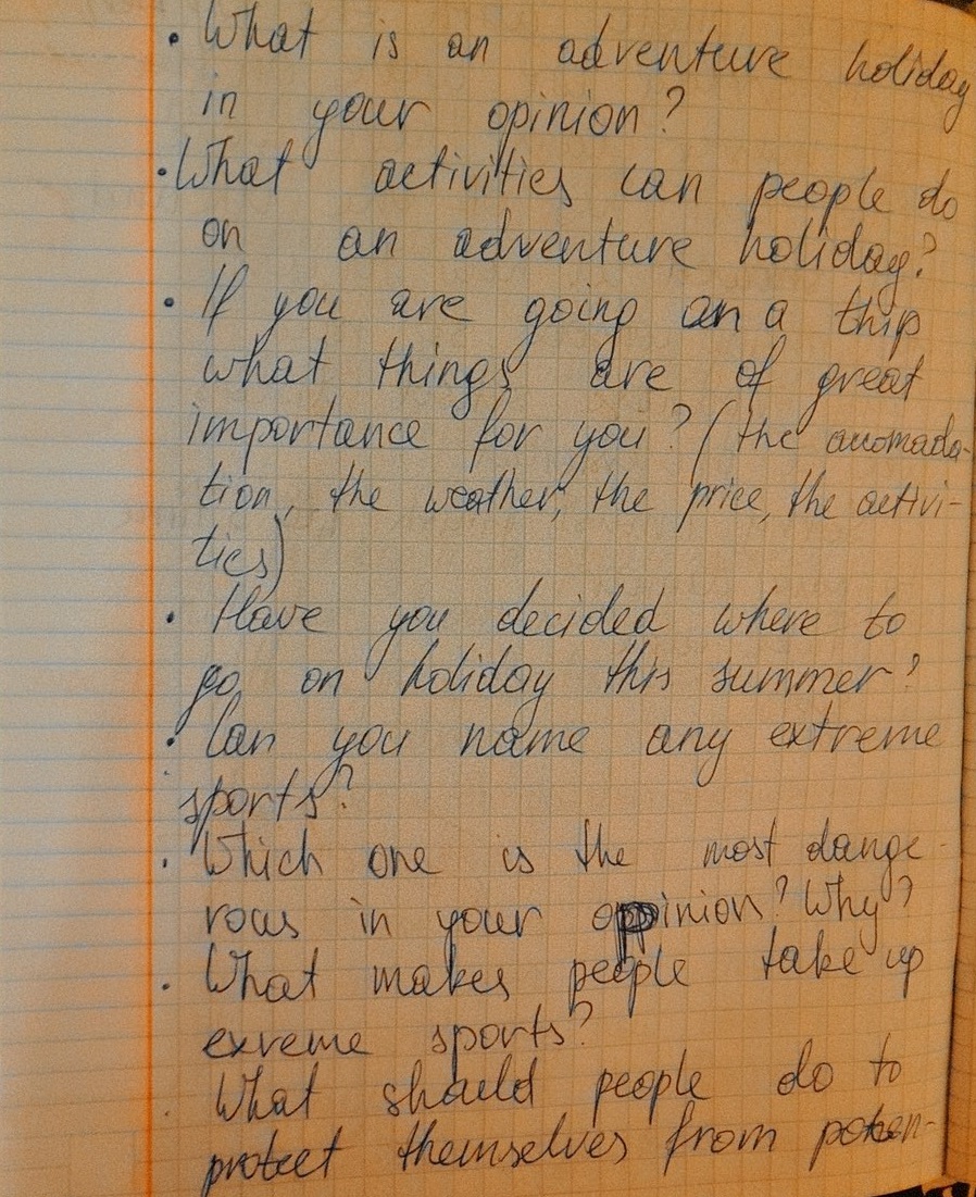 I haven’t decided where to go this summer but if I was going on an adventure holiday in winter I would go snowboarding so the weather would be extremely important for me. Another important thing would be safety so I would choose the equipment carefully.