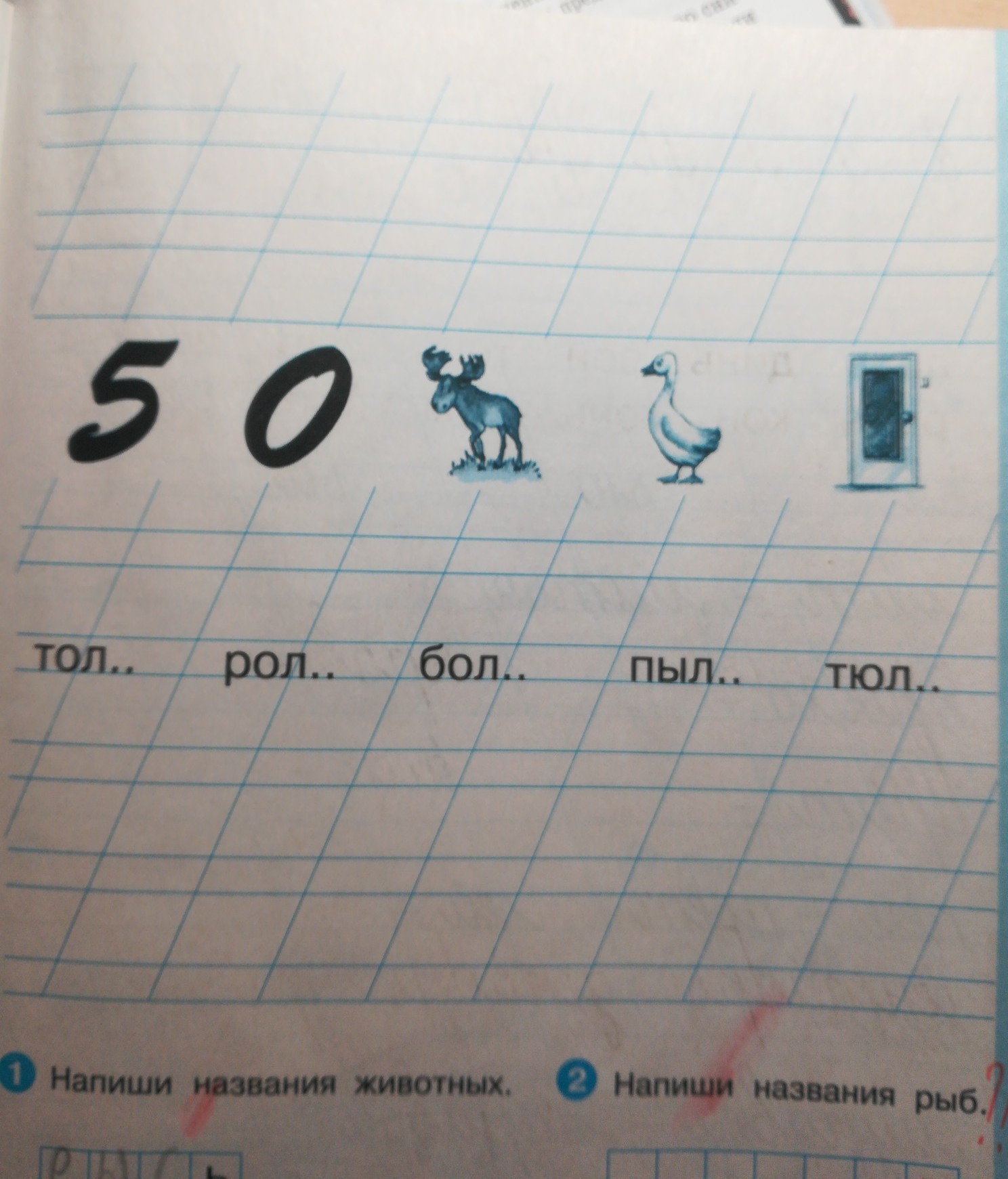 нужно написать слова "пять, ноль, лось, гусь, дверь"
