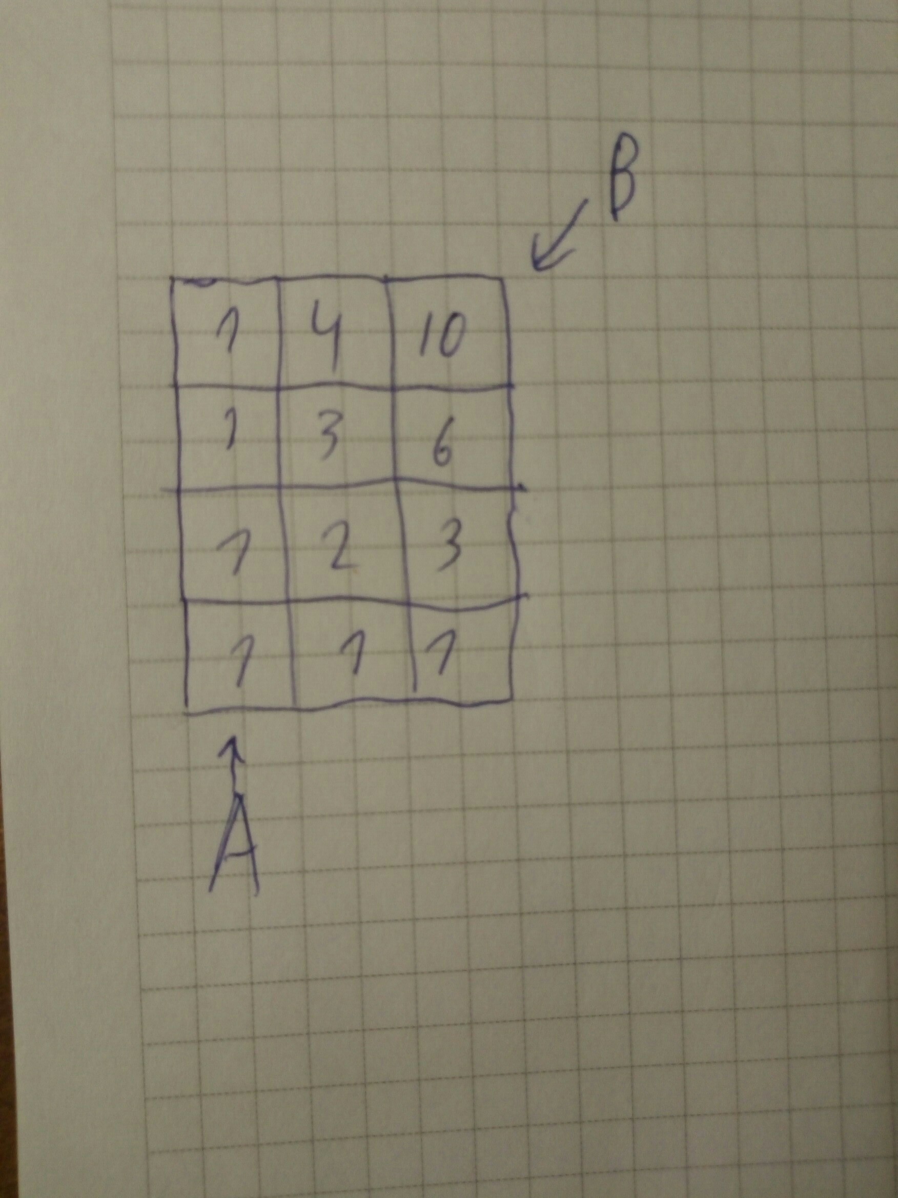 Из точки A двигаясь только вправо и вверх, должны дойти до точки B. Сколько способов есть?