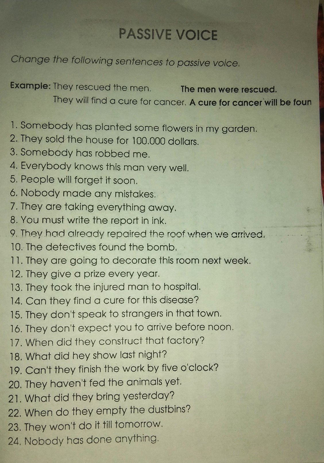 1. Кто-то посадил цветы сомо в моем саду. 2. Они продали дом за 100 000 долларов. 3. Кто-то ограбил меня. 4. Все хорошо знают этого человека. 5. Люди скоро это забудут. 6. Никто не допустил ошибок. 7. Они принимают все неправильно. 8. Вы должны написать отчет чернилами. 9. Они уже отремонтировали крышу, когда мы прибыли. 10. Детективы нашли бомбу. 11. Они собираются украсить комнату на следующей неделе. 12. Они раздают награды каждый год. 13. Они доставили раненого в больницу. 14. Могут ли они найти лекарство от этой болезни? 15. Они разговаривают с незнакомцами в этом городе. 16. Они ожидают, что вы прибудете до полудня. 17. Когда они строят эту фабрику? 18. Что он показал на ночь? 19 Разве они не могут закончить работу к пяти часам? 20. Они не кормили животных. 21. Что они привезли вчера? 22. Когда они убирают мусорные баки? 23. Они не будут делать это до завтра. 24. Никто ничего не сделал.