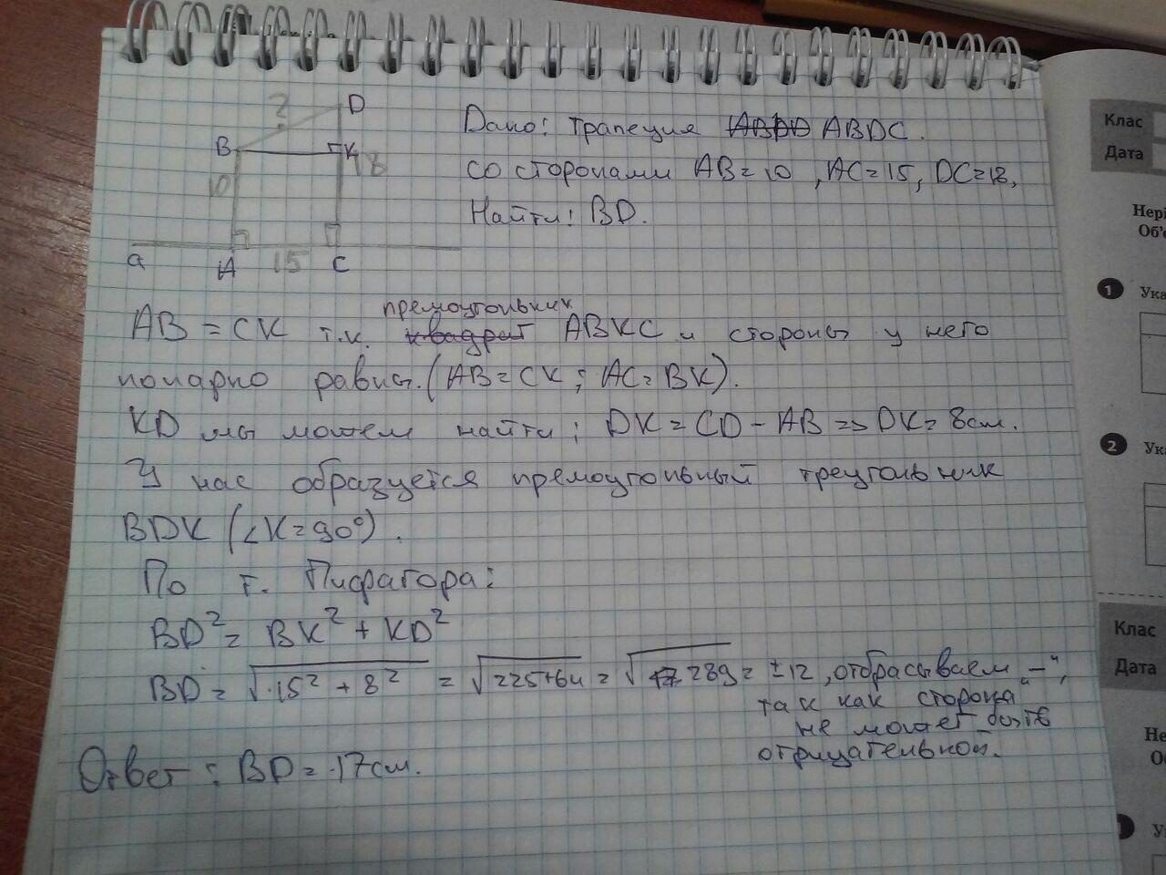 К плоскости проведены два перпендикуляра длиной 10 см и 18 см. Расстояние между основаниями перепендикуляров равно 15 см. Найдите расстояние между другими концами перпенликуляров