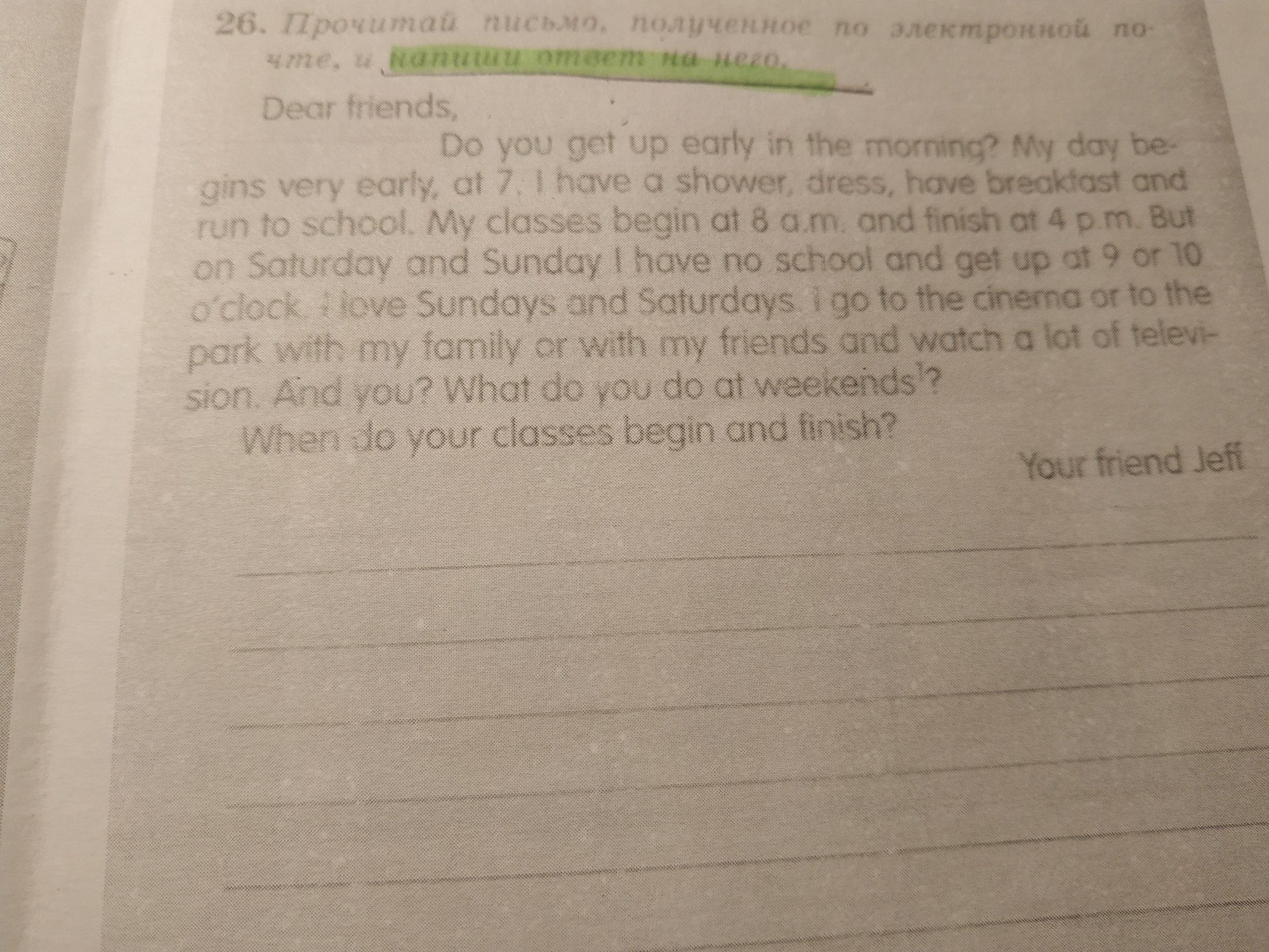 My day begins at 8 o'clock. I shower, dress, went to school. My lessons being at 9 and finish at 2 p.m. I have lessons on Saturday. On Sunday I get up at 10 o'clock.