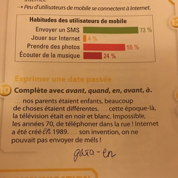 QUAND nos parents étaient enfants beaucoup de choses ètaient différentes À cette èpoque-la, le tèlèvision ètait en nour et balanc.impossible, AVANT les annès 70, de tèlèphoner dans la rue!Internet a ètè crèè en 1989 AVANT son inventi.on, on ne pouvat pas envoyer de mèls
