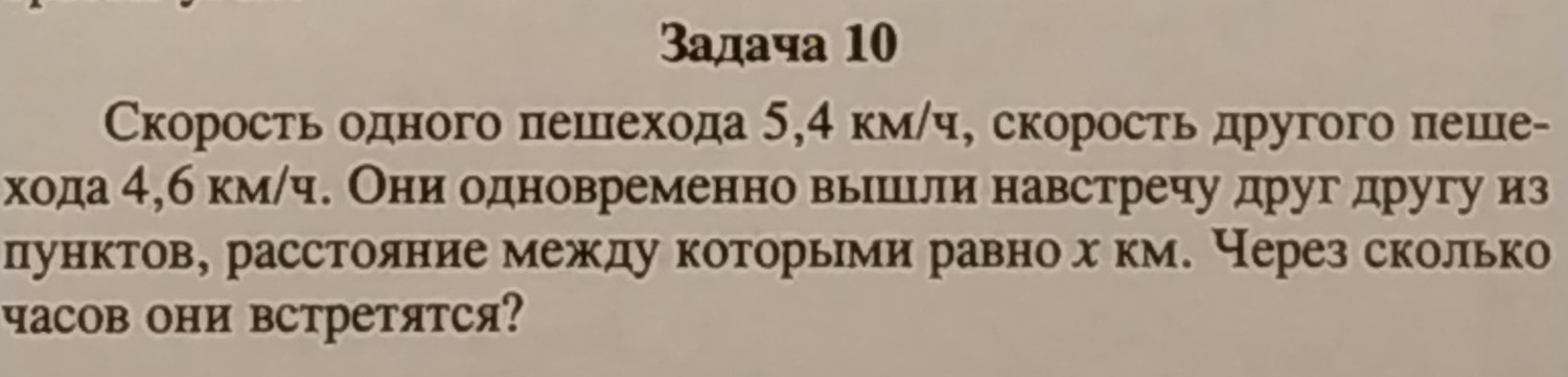 Пошаговое объяснение: 1.Скорость сближения=5,4 км/ч+4,6 км/ч=10 км/ч 2. Т.к Время=Путь/Скорость, то Время=х км/ 10 км/ч 3. Км сокращаются.