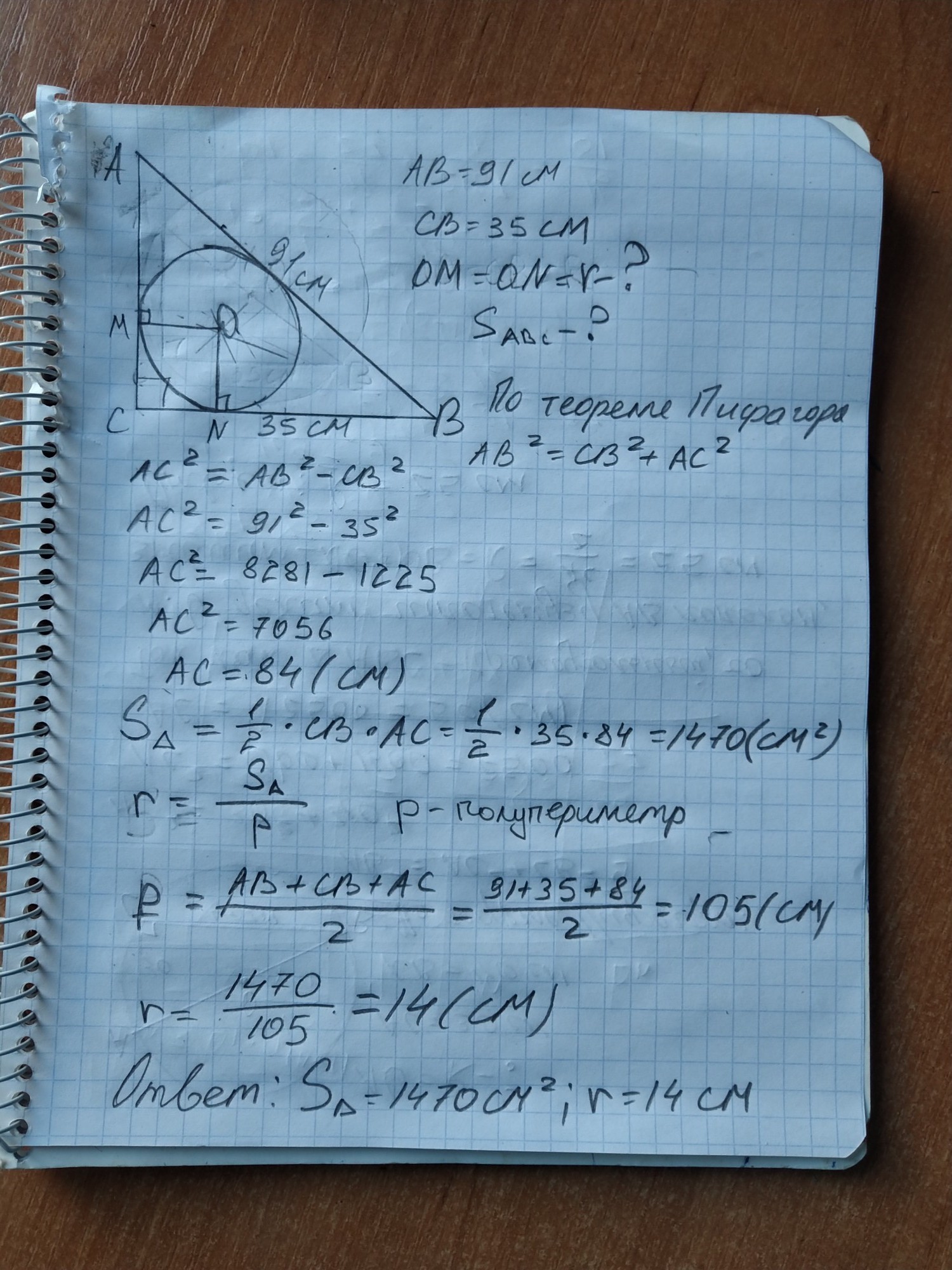Гип-за прямоугольного треугольника 91 см, а один из катетов 35 см. Найдите радиус окружности вписанной в треугольник и площадь треугольника.
