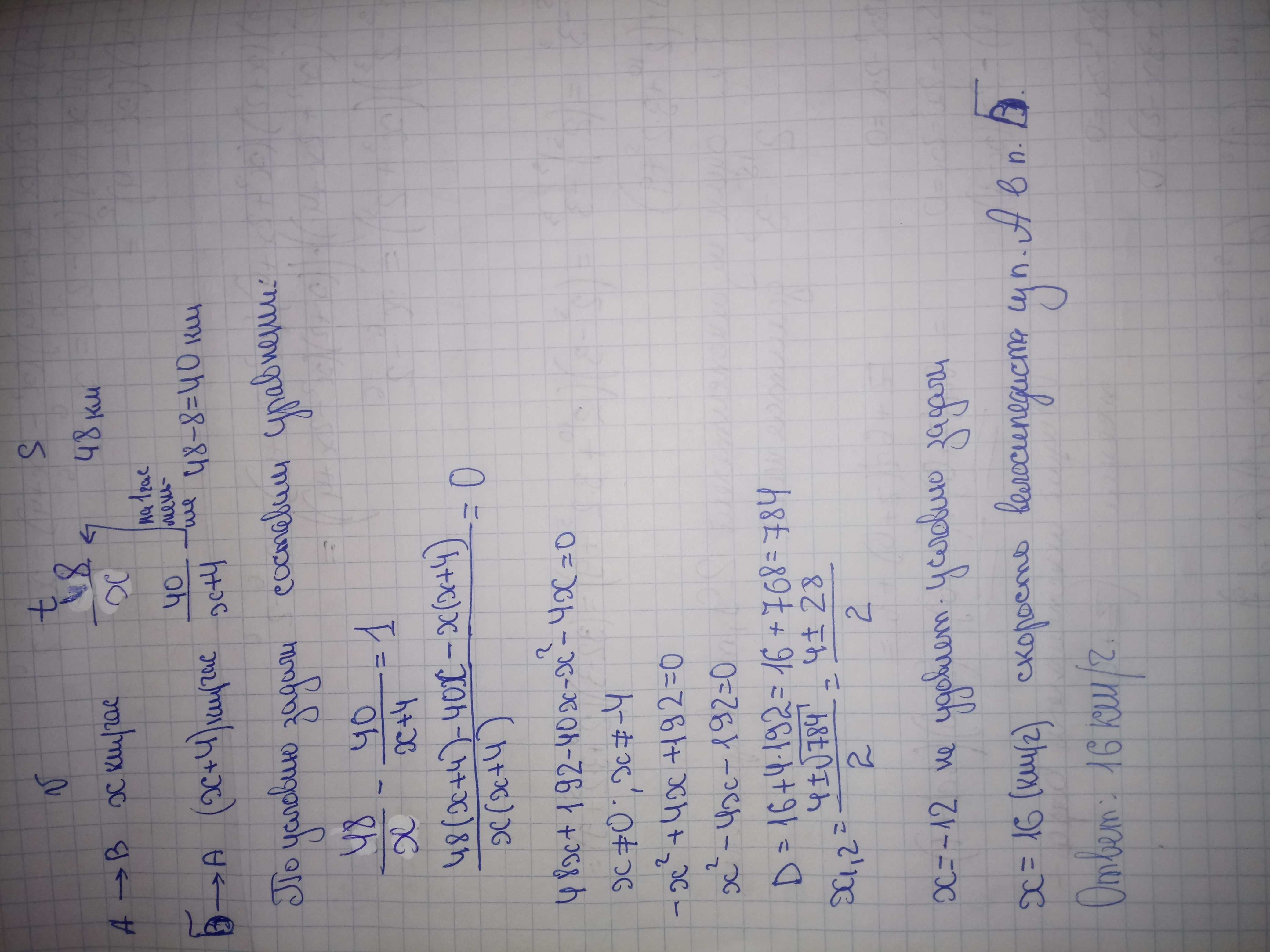 проехал по дороге длиной 48 км, обратно он возвращался по другой дороге, которая короче первой на 8 км. Увеличив на обратном пути скорость на 4 км/ч, велосипедист затратил На 1 час меньше, чем на путь из А в В. С какой скоростью ехал велосипедист из пункта А в пункт Б?