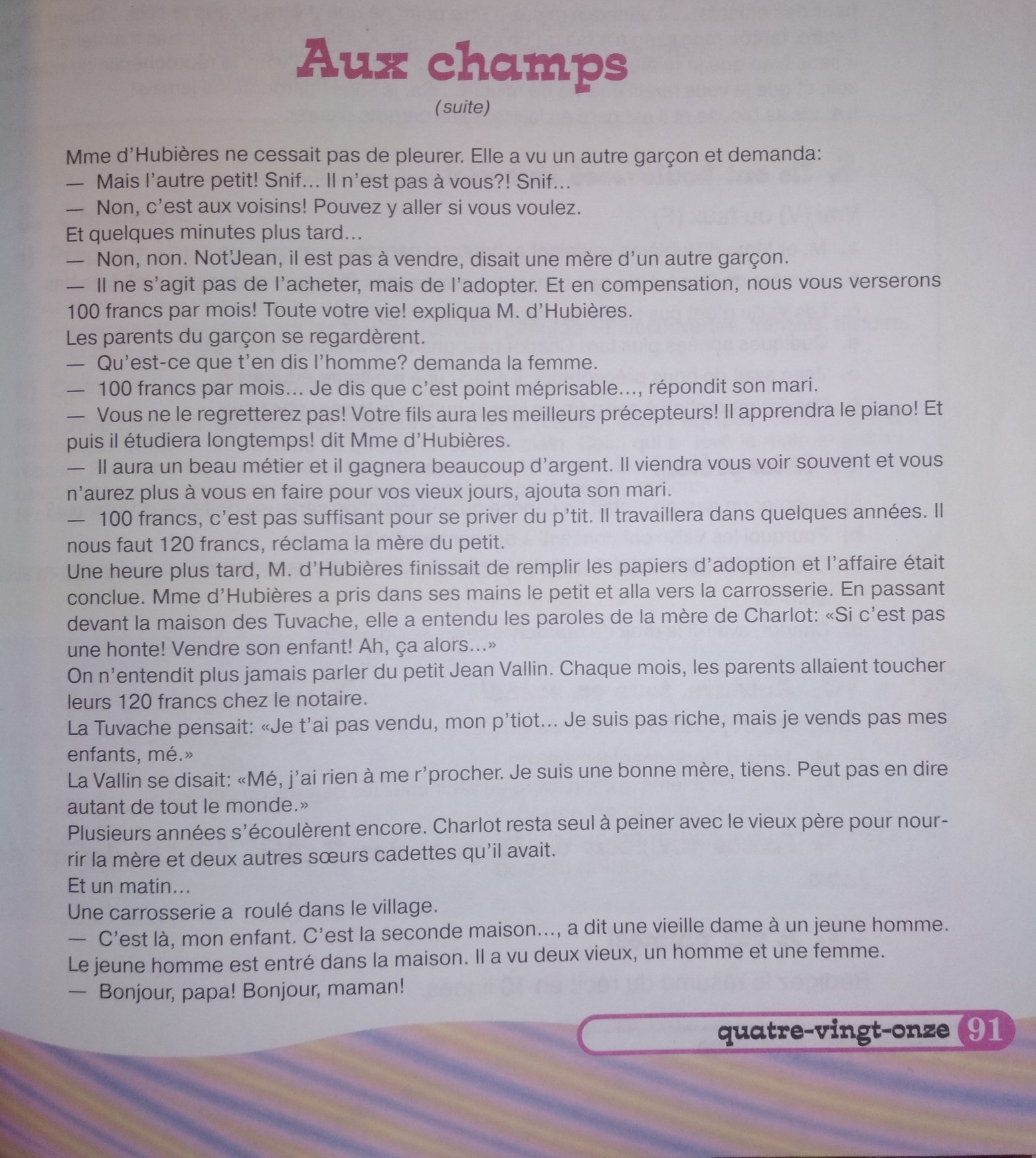 Aux champs (люкс) Mme d'Hubières не cessait pas de pleurer. Elle a vu un autre garçon et demanda: - Mais l'autre petit! Snif ... І н-е-е-ха-ха-ха? Snif. Non, c'est aux voisins! Увімкніть все, що вам потрібно, і ви отримаєте хвилини, а також номер, не. NotJean, il est à à vendre, disait une mère d'un autre garçon. Я не буду вдаватись до вибору, мабуть. Вона компенсується, тому що у вас є 100 франків за місяць! Toute votre vie! expliqua М. d'Hubières Les батьки du garçon себе розглядають. Qu'est-ce que t'en dis l'homme? попиту на фемку 100 франків за місяць ... Є ди-дже-к'ест точкою méprisable ..., відповів син марі Vous ne le regretterez pas! Віртуальні файлові аури є легіонерами! Il apprendra le piano! Так, ви можете скористатися даними! з Мем д'Обієр. -Il aura ООН beau métier et il gagnera beaucoup d'argent. Якщо у вас є можливість пожертвувати, ви можете скористатися послугами, які ви можете скористатися, і ви матимете 100 франків, і ви отримаєте достатньо грошей. Гості можуть відвідати цей готель. II nous faut 120 francs, réclama la mère du petit Уне heure плюс tard, М. d'Hubières finissait де remplir les papiers d'adoption et l'affaire était conclue. Гості можуть скористатися всіма необхідними можливостями для відпочинку. Нагадаємо, що він був де-ла-де-Туваче, але елен енту-ле-пароль-де-ла-мір де Шарло: «Si c'est pas une honte! Vendre син enfant! Ах, ça alors ... На n'entendit плюс jamais parler du petit Жан Валлін. Chaque mois, ле батьки allaient toucher leurs 120 francs che le leaire La Tuvache pensait: «Je t'ai pas vendu, mon p'tiot. «Зневажте Ме, що є, і я зроблю вас. Je suis une bonne mère, tiens. Ви можете скористатися цією програмою. »Плюси випустили заставку, щоб отримати доступ до інших кодексів. Et un matin. Це єдине місце в селі. - C'est là, mon e Le jeune. Шарлот-ресторану можна замовити. C'est la seconde maison ... я. homme est entré dans la maison. II a vu deux vieux, un homme et une fem Bonjour, тато! Bonjour, maman! quatre-vingt-onze 91