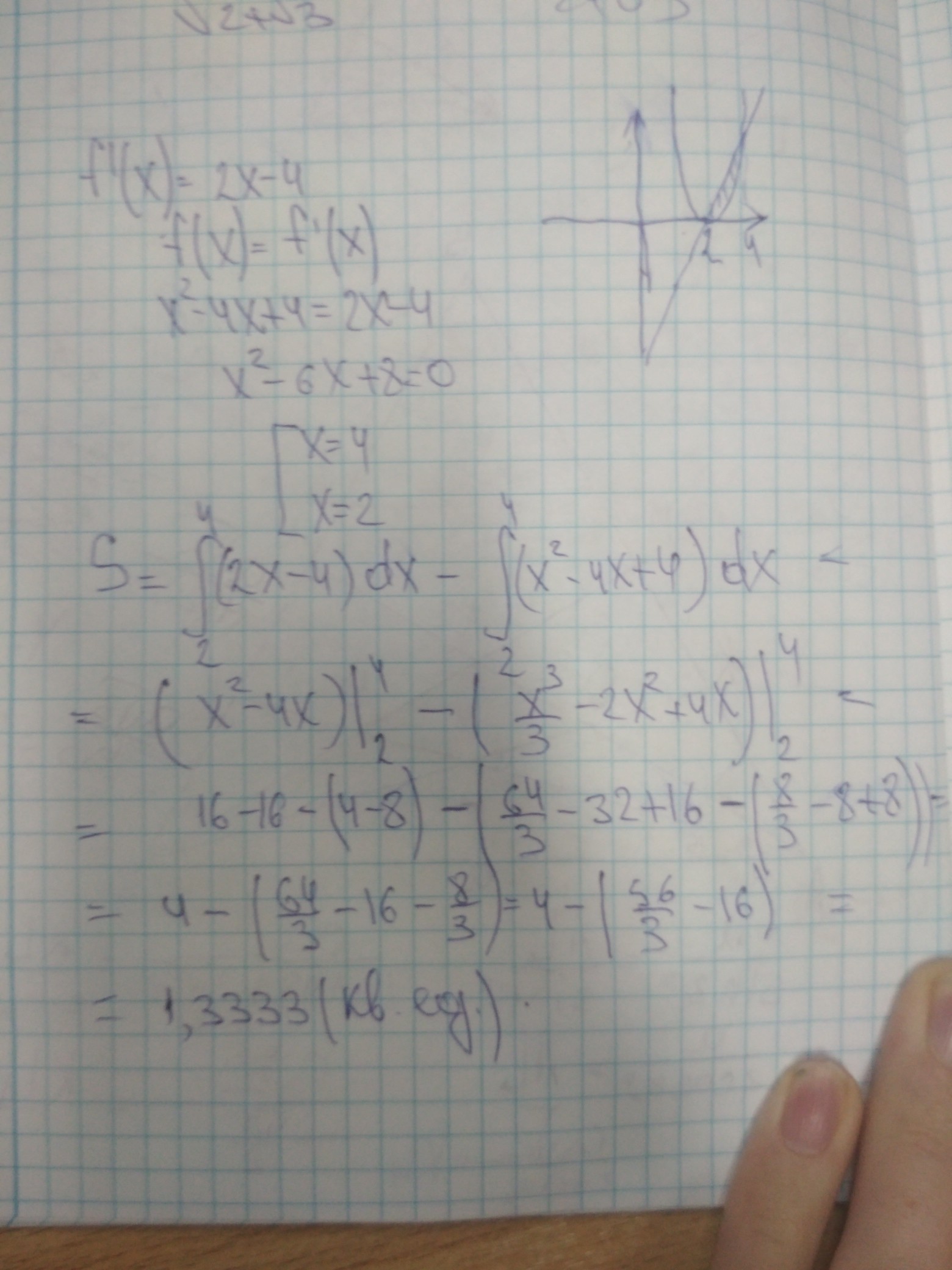 найдите площадь фигуры ограниченной графиком функции f(x)=x^2-4x+4 и графиком её производной f'(x)
