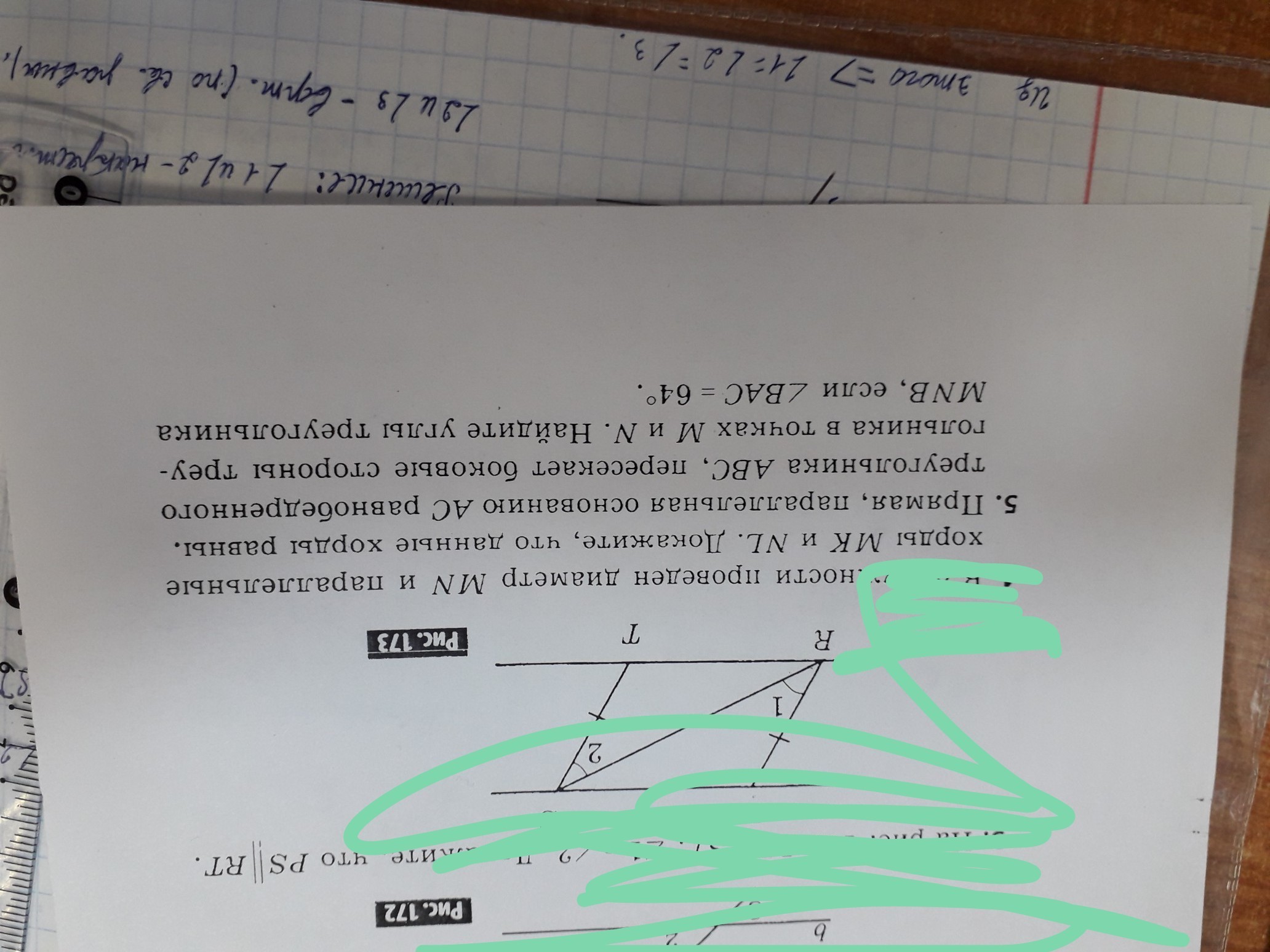 Сумма углов в треугольнике равна 180 градусов. В Треугольнике MNB угол MBN=180-2*64=52.