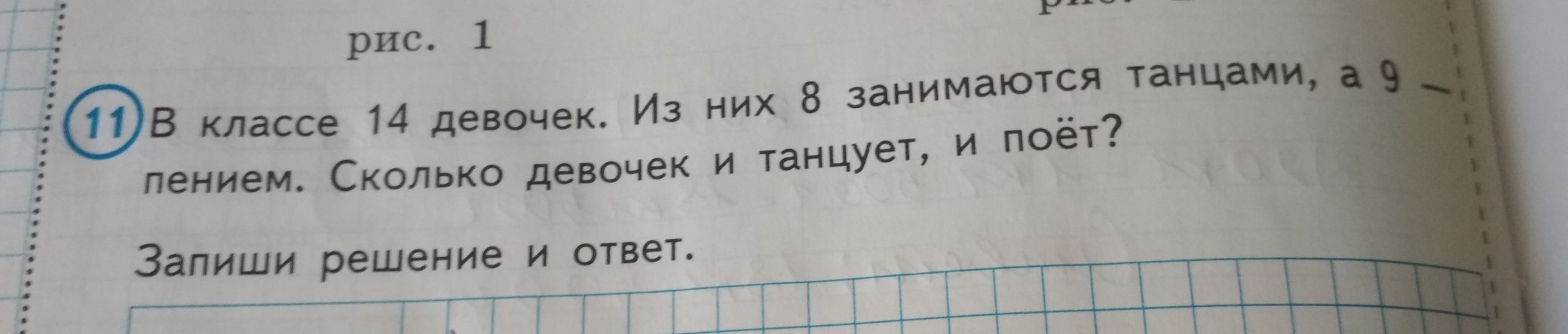 2)17-14=3 (девочек)-занимаются и танцами и пением.