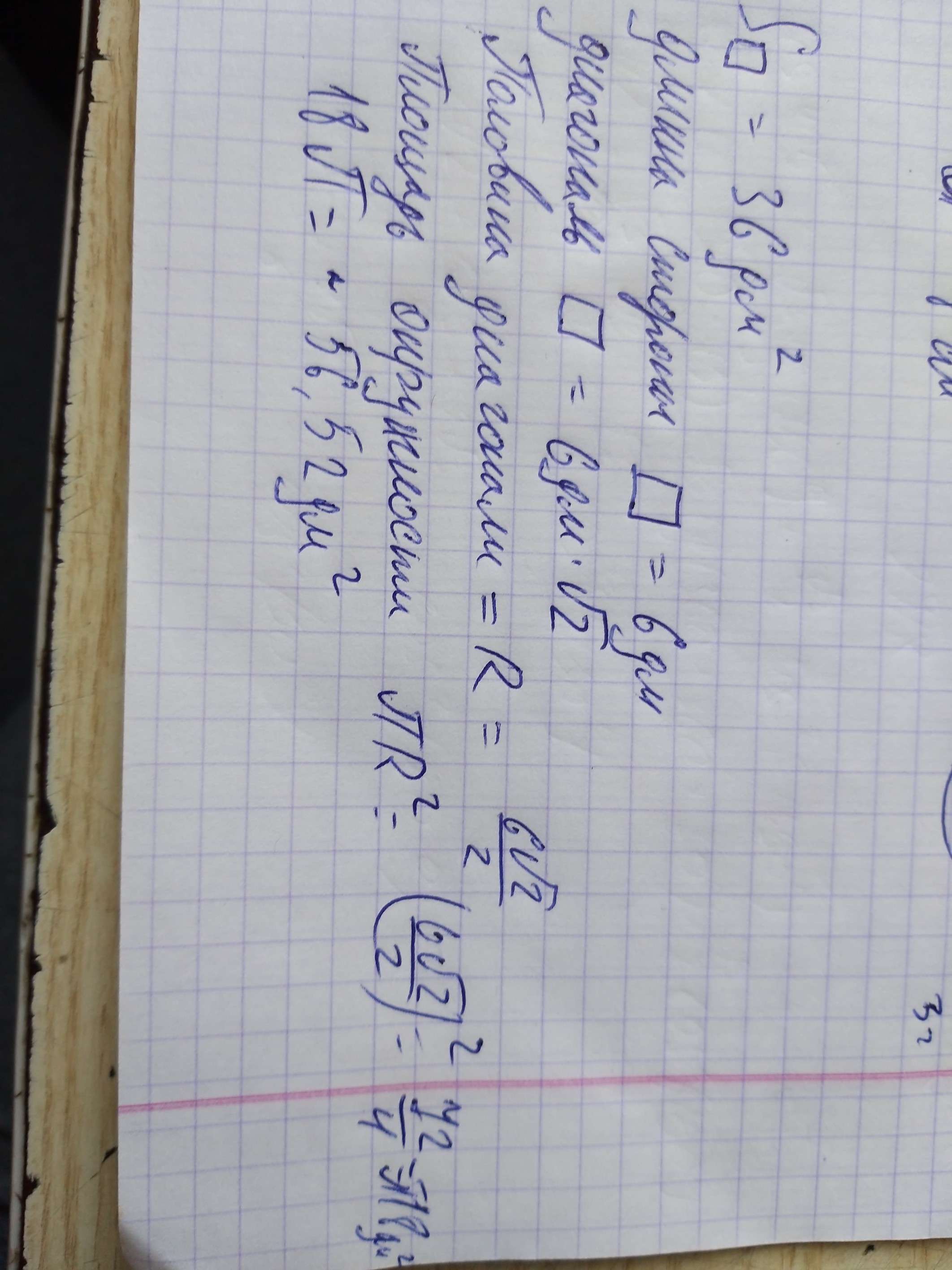 найдите площадь круга, если площадь вписанного в ограничивающую его окружность квадрата равна 36 дм 2