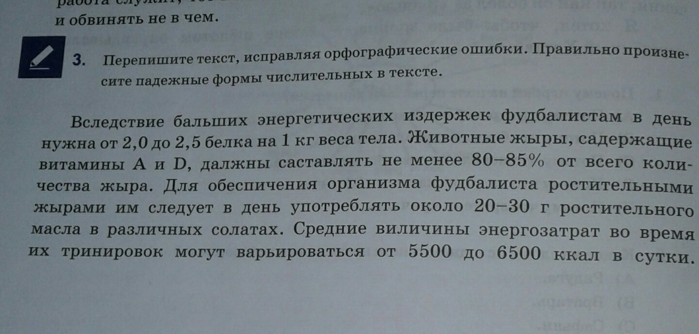 Вследствие больших энергетических задержек футболистам в день нужно от 2.0 до 2.5 белка на 1 кг веса тела. Животные жиры, содержащие витамины A и D, должны составлять менее 80 - 85% от всего количества жира. Для обеспечения организма футболиста растительными жирами им следует в день употреблять около 20-30 г растительного масла в различных салатах. Средние величины энергозатрат во время их тренировок могут варьироваться от 5500 до 6500 ккал в сутки.