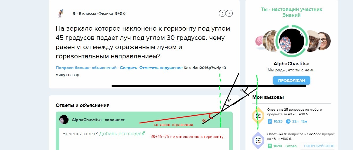 на зеркало которое наклонено к горизонту под углом 45 градусов падает луч под углом 30 градусов. чему равен угол между отраженным лучом и горизонтальным направлением?