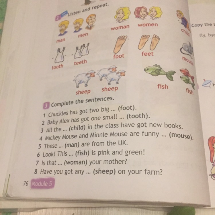 1 feet 2 tooth 3 children 4 mice 5 men 6 fish 7 woman 8 sheep