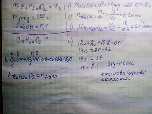 В результате гидролиза эфира этиленгликоля и насыщенной одноосновной кислоты образовалось 18 г кислоты на нейтрализацию которой потратили 120 г раствора щелочи с массовой долей гидроксида натрия 10%. По какой кислоты был образован эфир?)