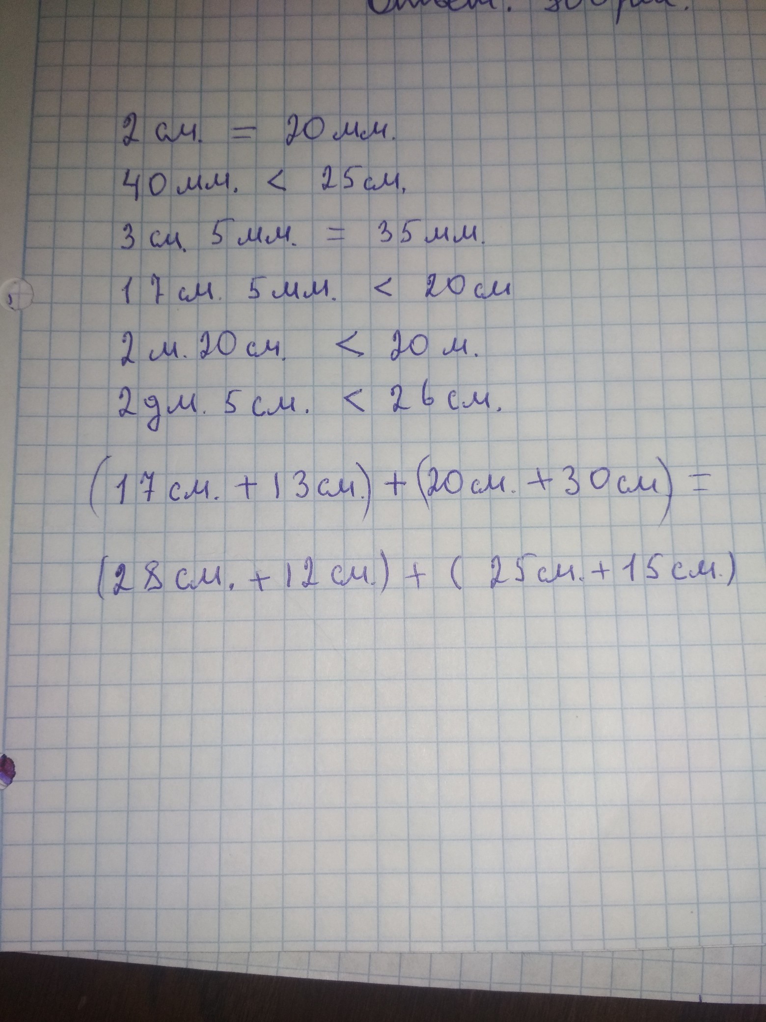 1)Сравните длине. 2 см и 20 мм. 40 мм и 25 см. 3 см 5 мм и 35 мм. 17 см 5 мм и 20 см.2 м 20 см и 20 м. 2 дм 5 см и 26 см. 2) Вычислите удобном способом, пользуясь такими свойствами сложения как перестановка и группировка. 17 см+20 см+13 см+30 см. 25 см + 28 см +12 см+15 см .