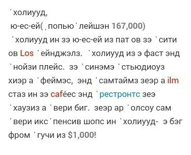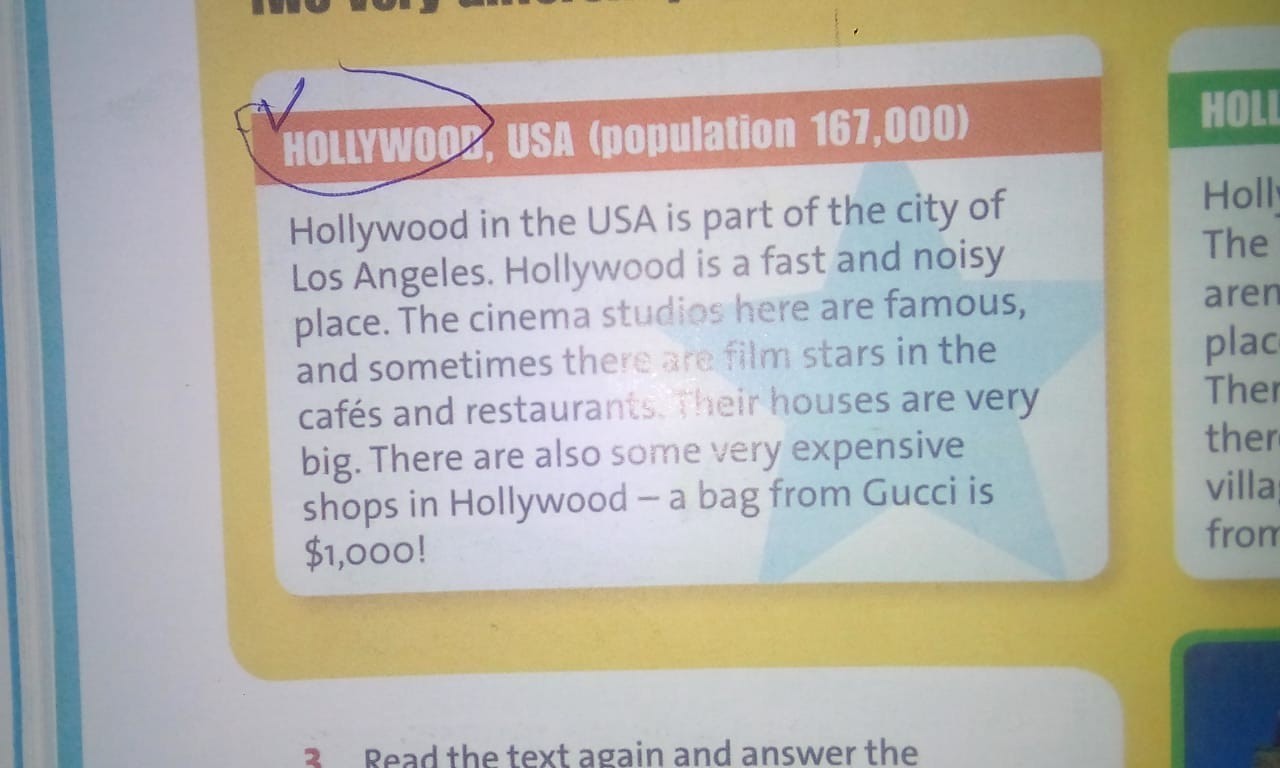 ГОЛЛИВУД, США (население 167 000 человек). Голливуд в США является частью города Лос-Анджелес. Голливуд - быстрое и шумное место. Киностудии здесь известны, и иногда в кафе и ресторанах встречаются звёзды, их дома очень большие. В Голливуде также есть несколько очень дорогих магазинов - сумка от Gucci стоит 1000 долларов!