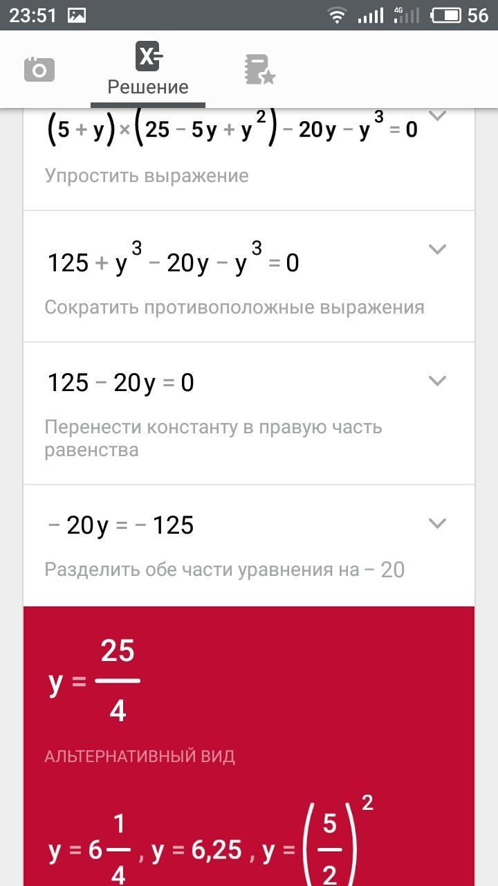 4) (5 + у)(25 - 5у + у²) - 20у - у³ = 0