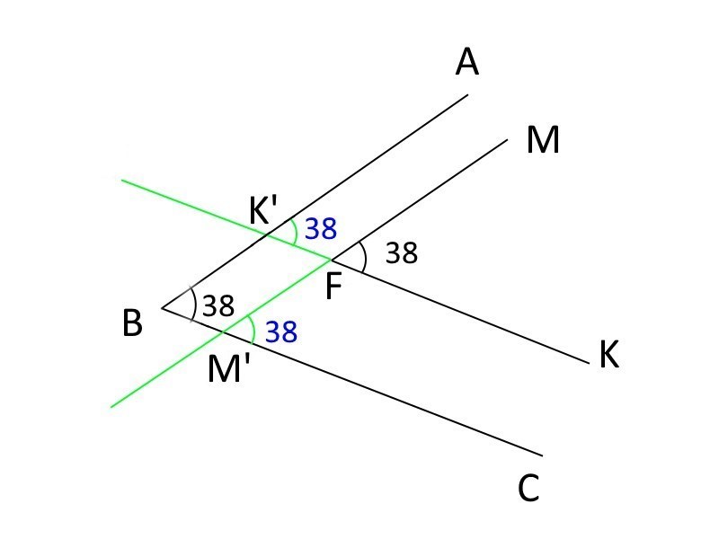 Полученный меньший ∠MFK в с вершиной в точке F равен ∠АВС=38°, так как для луча ВА и параллельной ему прямой ММ' луч ВС и является секущей и ∠АВС = ∠ММ'C=38°, а для луча ВС и прямой К'К прямая ММ' также является секущей и ∠ММ'C=∠MFK =38°