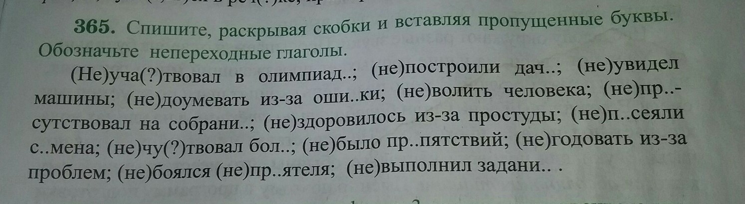 не участвовал в олимпиаде,не построил дачу, не увидел машины,недоумевать из-за ошибки,не волить человека,не присутствовал на собрании ,нездоровилось из-за простуды,не посеяли семена,не чуствовал боли,не было припятствий,негодовать из-за проблем ,не боялся неприятеля,не выполнил задание.